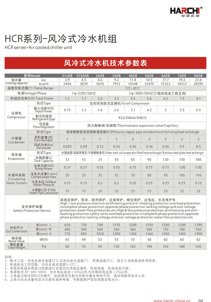 產(chǎn)品特點Features: 1、采用國際最先進的渦旋式或活塞式壓縮機,電器及制冷系統(tǒng)原器件全部為世界著名品牌; 2、冷卻水泵及管路系統(tǒng)全部采用不銹鋼材質(zhì),確保水質(zhì)更潔凈,使用壽命更長久、制冷效果更穩(wěn)定; 3、風冷冷凝器全部采用進口風機及大風量低噪音軸流設(shè)計,噪音更低、換熱效率更高; 4、風冷系列無需配置冷卻水塔及冷卻水泵,安裝簡單,移動方便,適合生產(chǎn)場地比較緊缺的環(huán)境使用; 5、機組采用進口高精度電子顯示器,內(nèi)置P.I.D 自動演算功能,啟動延時功能,控溫精度在±0.5℃范圍內(nèi),且控制溫度范圍在3℃~40℃之間; 6、為保證使用安全,機組內(nèi)置漏電保護器、相位保護、過載保護、電流保護;系統(tǒng)安裝了高、低壓保護傳感器,為防止缺水或循環(huán)水系統(tǒng)內(nèi)部結(jié)冰,機組安裝了流量開關(guān)和低液位保護裝置。