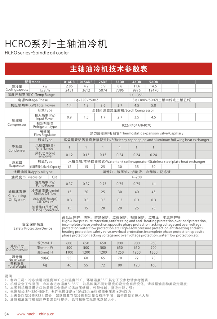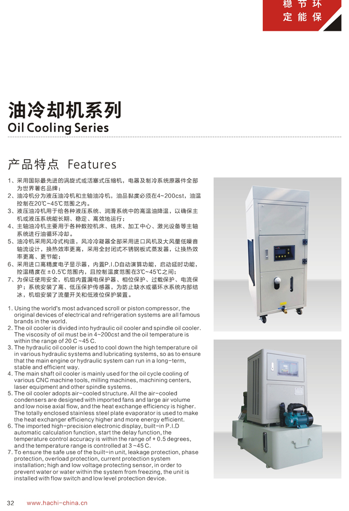 1、制冷能力是在環(huán)境溫度35℃,進(jìn)油溫度35℃,出油溫度30℃,油品為ISO VG32條件下測得。 2、用戶在選擇油冷機(jī)時,必須選擇油液需控制的溫度范圍(1)18℃-25℃ (2)25℃-35℃ (3)35℃-45℃ (4)45℃以上。本公司推薦液壓油合理的溫度控制范圍為35℃-45℃. 3、本機(jī)組內(nèi)置冷卻油箱,接口可用軟硬管連接,且加裝過濾器。 4、機(jī)組操作面裝有冷卻液油箱液拉顯示裝置,方便快捷查看液位。 5、機(jī)組內(nèi)部裝有油泵,可根據(jù)需要調(diào)節(jié)冷卻液的流量及壓力。 6、機(jī)組采用高精度電子顯示器,內(nèi)置P.I.D自動演算功,延時啟動功能。 7、以上機(jī)組使用環(huán)境為5~42℃,42℃以上屬高溫機(jī)組,外形尺寸及相關(guān)參數(shù)會有所變更,請選型時注意。 8、參數(shù)表內(nèi)為本公司標(biāo)準(zhǔn)機(jī)型,本公司接受客戶非標(biāo)機(jī)器訂做. 適用種類: ◇ CNC車床、銑床、磨床、拉床 ◇ CNC旋轉(zhuǎn)臺、油壓機(jī)、木工雕刻機(jī) ◇ CNC立式/臥式加工中心、綜合切削加工中心 ◇ 高速機(jī)械主軸、電主軸、靜壓(動靜壓)主軸 ◇ 各種機(jī)械的液壓站及潤滑系統(tǒng) ◇ 放電加工設(shè)備、慢走絲、研磨機(jī)、試驗(yàn)室設(shè)備、激光設(shè)備等..
